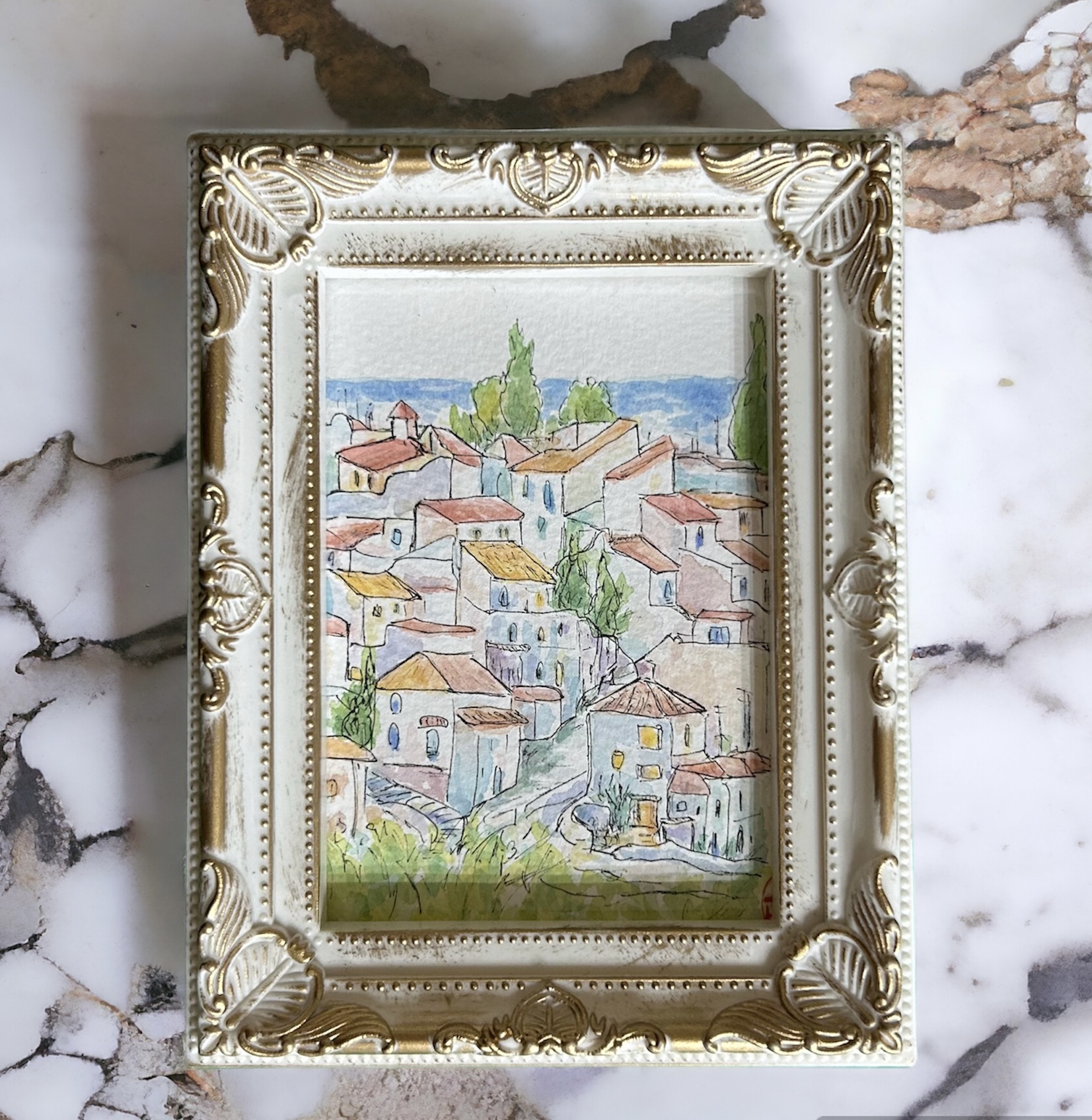 島の夏(ギリシャ、サントリーニ島、ミニ絵画、透明水彩、写真立て付き)